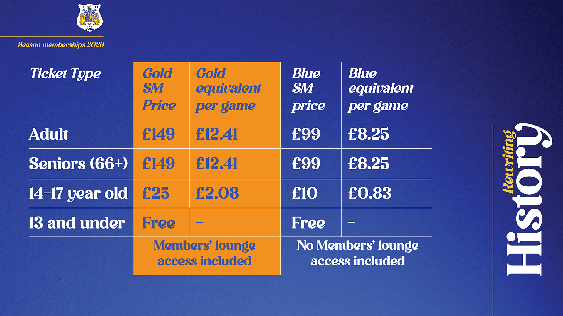 Our 2026 Season Memberships are now on sale - with prices frozen for another year meaning adults can watch from the equivalent of just £8.25 per game.